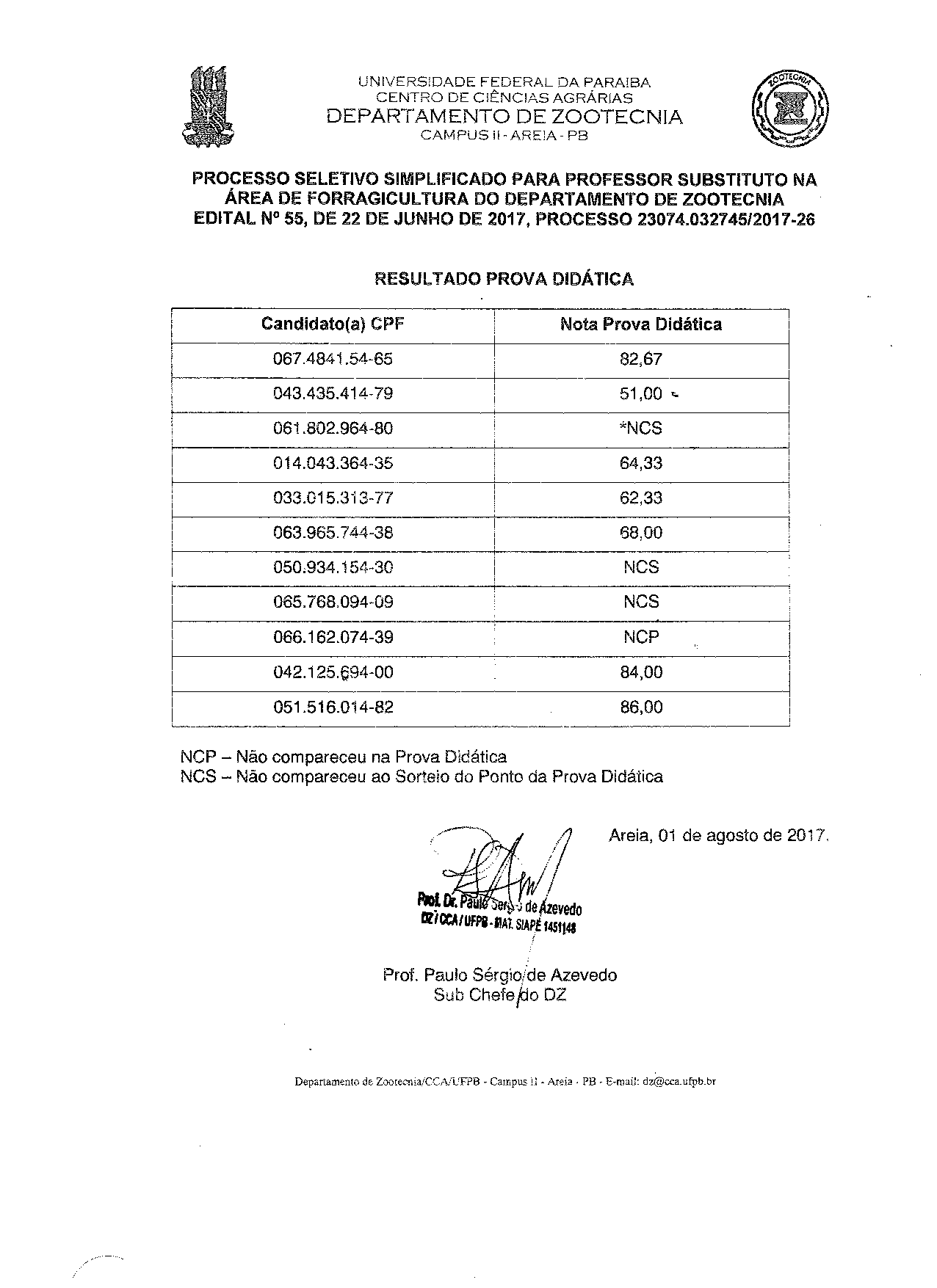 Divulgado o resultado da Prova Didática do Concurso para Professor Substituto na área de Forragicultura (01 vaga T-20), do Departamento de Zootecnia (DZ) do Centro de Ciências Agrárias (CCA) da Universidade Federal da Paraíba (UFPB).