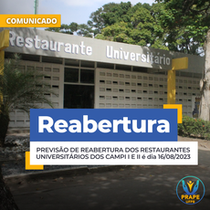 Notícias COMUNICADO Nº 39/2023 PREVISÃO DE REABERTURA DOS RESTAURANTES UNIVERSITÁRIOS DOS CAMPI I E II Tweet publicado: 07/08/2023 14h16, última modificação: 07/08/2023 14h16 COMUNICADO Nº 39/2023