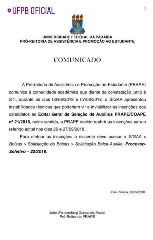 Comunicado da PRAPE - Reabertura das inscrições e novo cronograma para o edital Geral de Seleção de Auxílios.