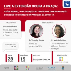 A assessoria de extensão do CCHLA, buscando continuar as ações dos projetos de extensão durante o isolamento social, está desenvolvendo a segunda atividade online para o mês de maio. Na próxima quinta (28/05) ocorrerá às 15h, a aula pública “Saúde mental, precarização do trabalho e democratização do ensino no contexto da pandemia da COVID-19” vinculada ao projeto “A Extensão Ocupa a Praça”. A atividade contará também com a emissão de certificados para os/as participantes.