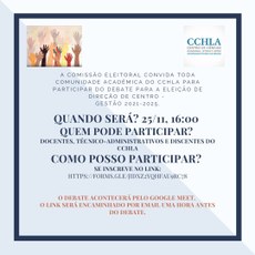 A Comissão eleitoral do CCHLA convida toda comunidade acadêmica para participar do nosso momento de debate com a chapa inscrita para direção de centro, gestão 2021 - 2025. O debate será realizado dia 25/11, às 16:00hs. Para participar, você deve se inscrever pelo link: https://forms.gle/jiDXZ2YqHfaU9RC78