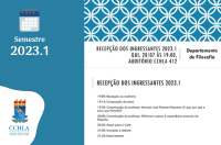Olá, discentes de Filosofia! O Departamento do Curso irá recepcionar os ingressantes 2023.1 no Auditório CCHLA 412, na próxima quinta-feira (20), às 19h.