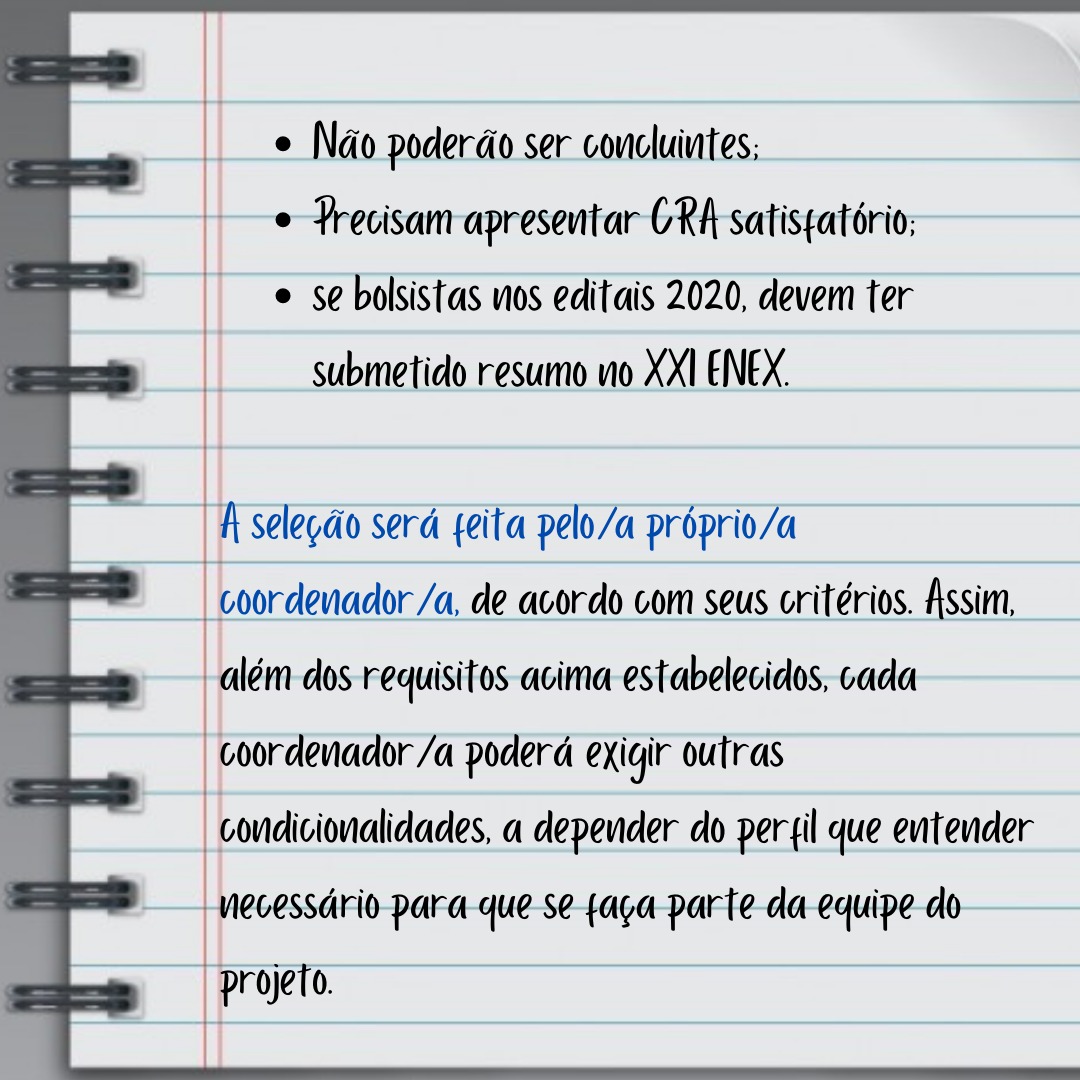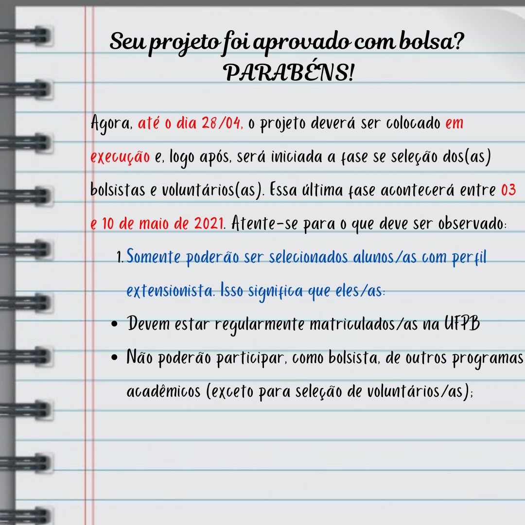 Informamos, ainda, que após as aprovações dos projetos, há etapas a serem realizadas. Sendo assim, os flyers disponibilizados contém orientações importantes que auxiliam os coordenadores(as) nesse processo.