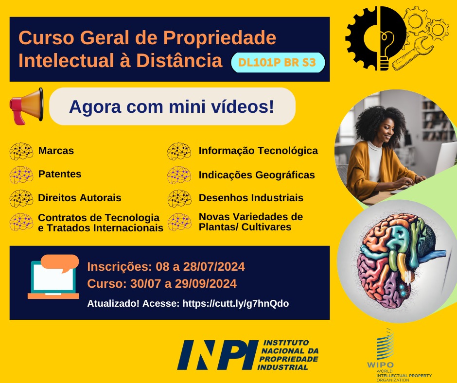A Diretoria de Propriedade Intelectual da Agência UFPB de Inovação Tecnológica divulga o curso Geral de Propriedade Intelectual (EaD) ofertado pelo Instituto Nacional da Propriedade Industrial (INPI) em parceria com a Organização Mundial da Propriedade Intelectual (OMPI). A 3ª edição de 2024 do DL 101P BR já está com inscrições abertas e seu conteúdo é em língua portuguesa.