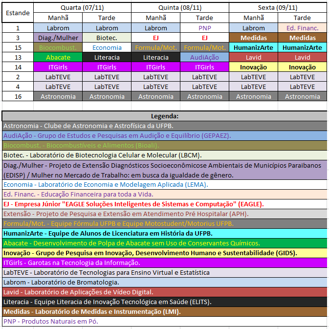 Os grupos de ensino, pesquisa e extensão da UFPB que irão participar estão assim divididos (conforme estande):